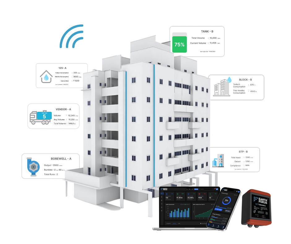 EarthFokus combines precision-grade meters, secure telemetry, and smart analytics to give you live visibility and actionable insights across your entire water network — from inlets and storage tanks to pipelines, fixtures, and discharge points.