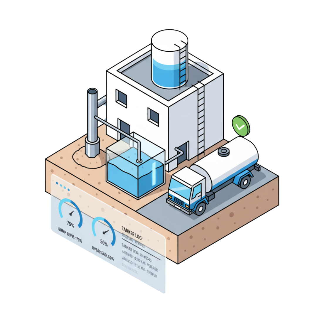 Gain complete visibility across all your water sources — from borewells and rainwater harvesting tanks to sumps, overhead tanks, and tankers. EarthFokus monitors live tank levels, verifies tanker arrivals, tracks borewell drawdowns, and prevents overflows — helping you control supply, reduce dependency, and meet groundwater compliance.